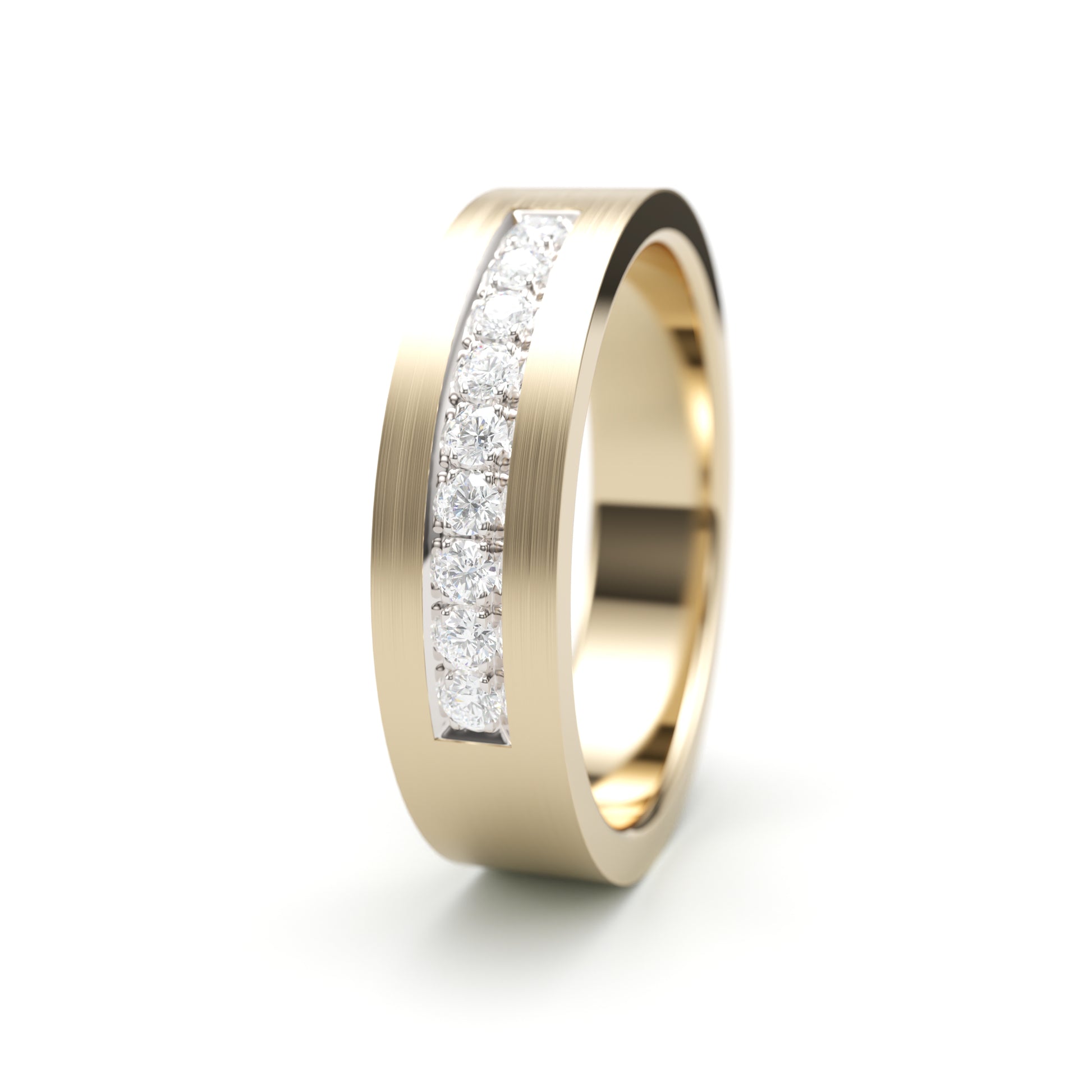 Solid Gold Wedding Band with diamonds. Two tone brushed top. 6mm